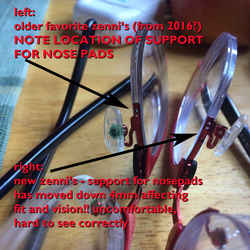 BIG PROBLEM! Reordered these glasses because the pair from 2016 have peeling at the bottom edge of the lenses. UNFORTUNATELY the fit is different, even after adjustments for comfort - the nose pads are in a different location in the new pair - so cannot see well, and can't make them comfortable. THE SUPPORT FOR THE NOSEPADS ON THE NEW PAIR IS 4MM LOWER THAN THE SUPPORTS ON MY ORIGINAL PAIR. WHAT NOW????? help.
