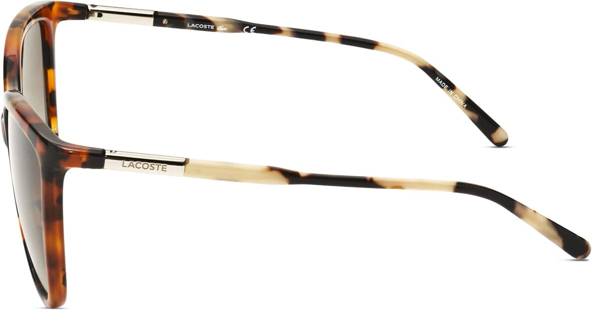 Exuding a bold and contemporary charm, these XL square Lacoste Brand's sunglasses feature a full-rim frame crafted from lightweight TR-90 plastic, making a stylish statement. This XL frame ensures a comfortable, secure fit for everyday wear, while offering optimal sun protection and everyday sophistication for women. Particularly flattering for heart and oval face shapes, these sunglasses add a distinguished touch to your look with their sophisticated and elegant style. Designed to blend fashion and functionality, these sunglasses are the perfect accessory for women seeking both style and comfort in their daily ensemble.