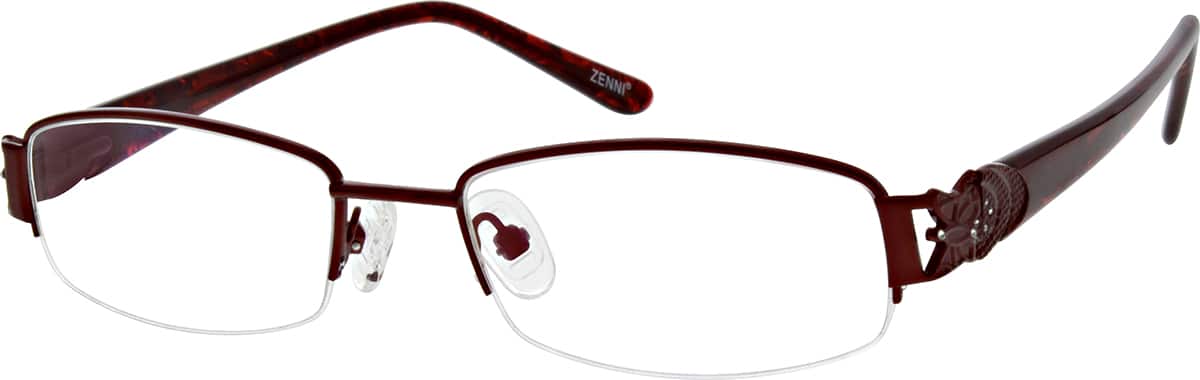 Durable spring-action temples for lasting, pressure-free comfort.This half-rim women's frame is made from metal alloy and acetate. It comes with adjustable silicone nosepads, spring hinges and metal ornaments on the temple arms. Note: The patterns on the temples are randomly selected.