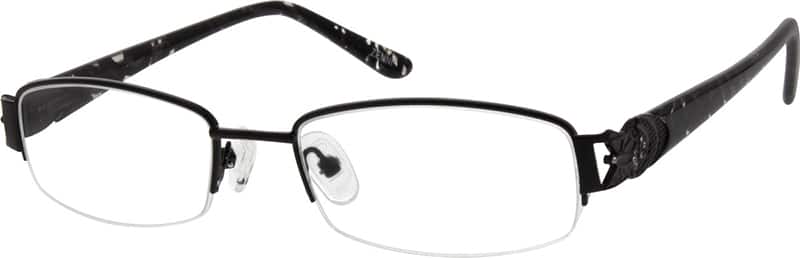 Durable spring-action temples for lasting, pressure-free comfort.This half-rim women's frame is made from metal alloy and acetate. It comes with adjustable silicone nosepads, spring hinges and metal ornaments on the temple arms. Note: The patterns on the temples are randomly selected.