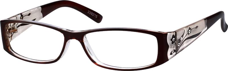 Easy returns with industry-leading customer satisfaction.A full-rim plastic frame, this medium wide pair of glasses has a black frame front, scalloped at the corner, with a frosted translucent backing for the black flowers, with crystals, decorating the temple arm. To virtually try on the frame, we encourage you to upload your picture on your computer, into the Zenni Frame Fit feature for your personal sizing.