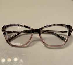 The frame is very sturdy and not too heavy. The color has hints of blue, purple, pink and grey. The colors are pretty but definitely not as bright as the stock photo. The shape is very flattering and not overly dramatic. It does slide down my nose a bit, but I’m sure a small adjustment will improve that. All in all, I would recommend this frame.