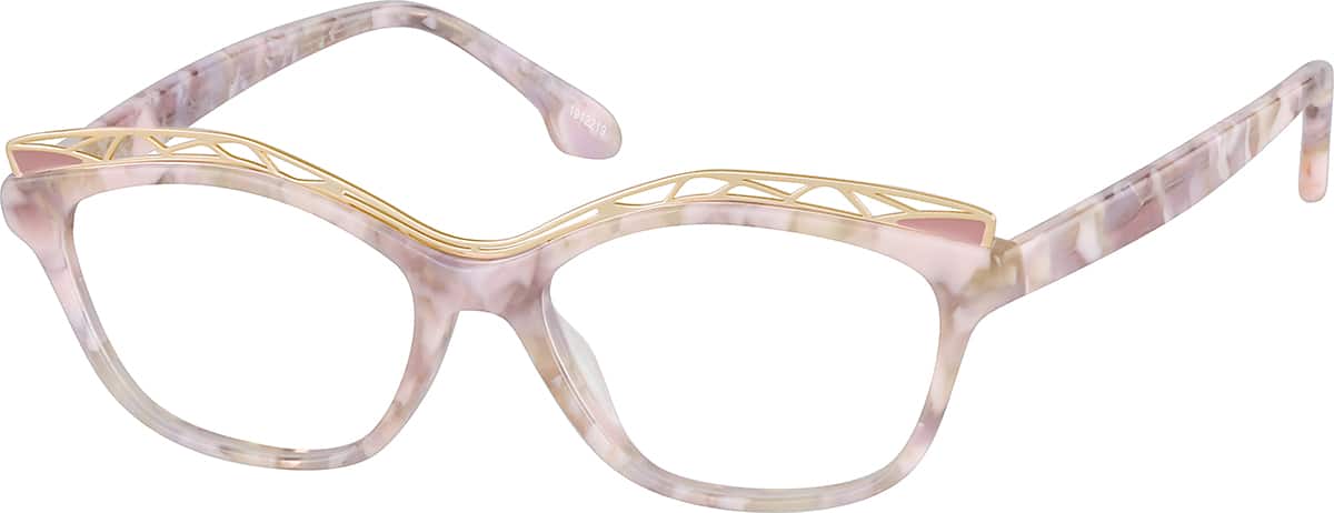 Easy returns with industry-leading customer satisfaction.These geometric glasses feature a marble pattern with a stunning gold metal cut-out design on the brow. Made with hand-polished acetate, the medium-wide frame comes in pink or cream.